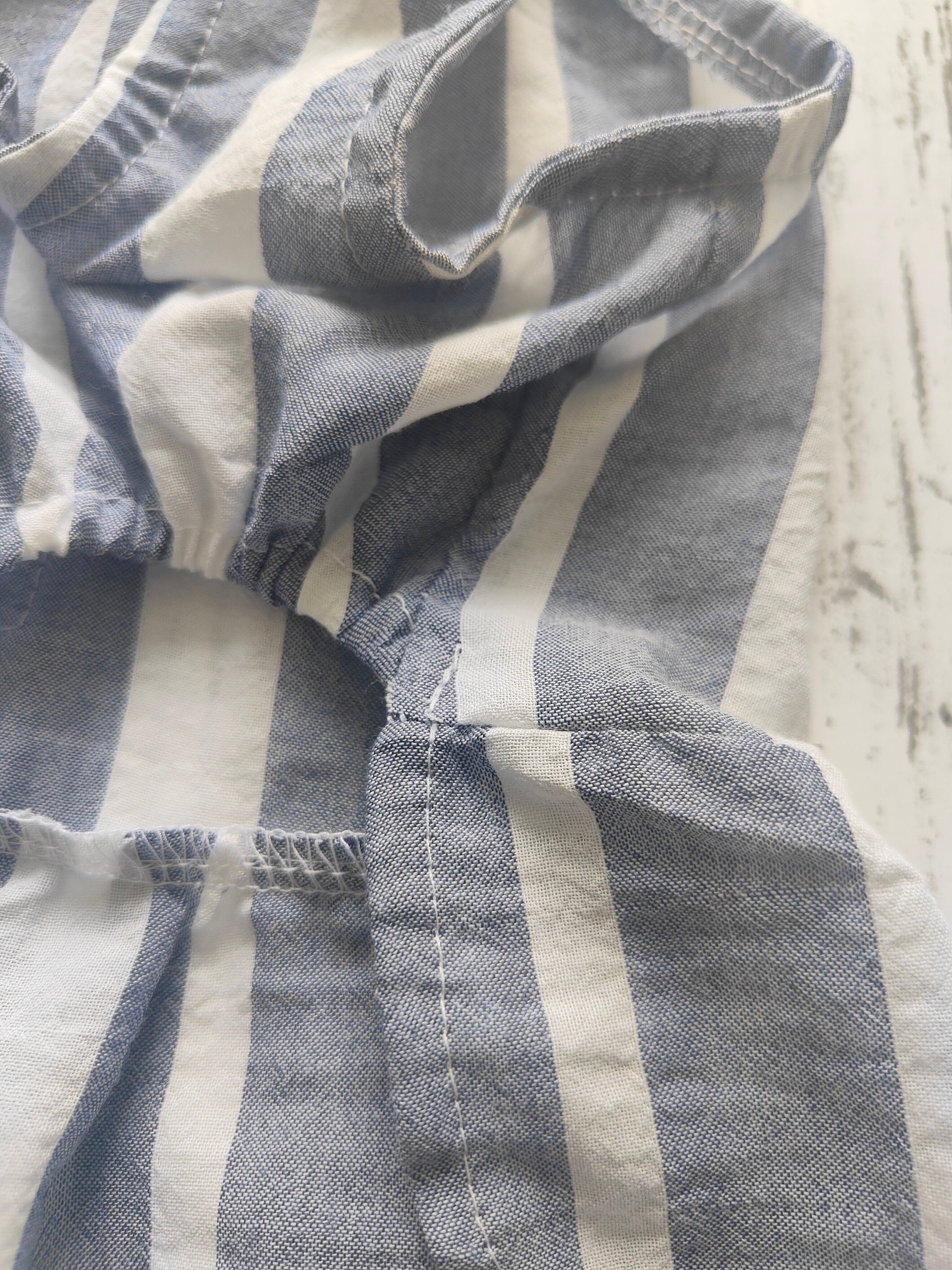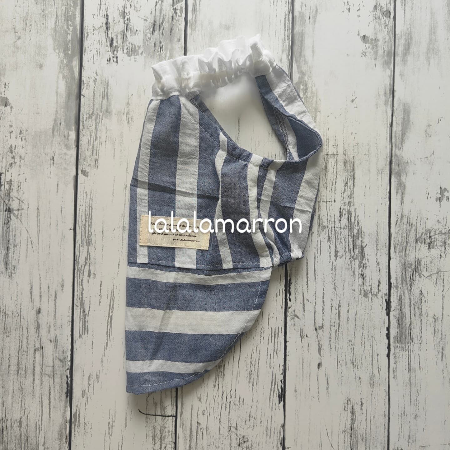 ネイビーブルーとグレーがかったホワイトの、幅の違うストライプ柄の生地、先染めのコットン生地で、さらっとやわらかく軽やかです。
