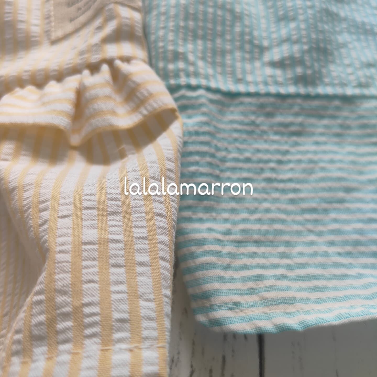 先染めのコットンサッカーストライプ生地、細めのピンストライプで、お色はブルーとイエローの2カラーです。イエローの方がストライプ幅が少し太めです。
