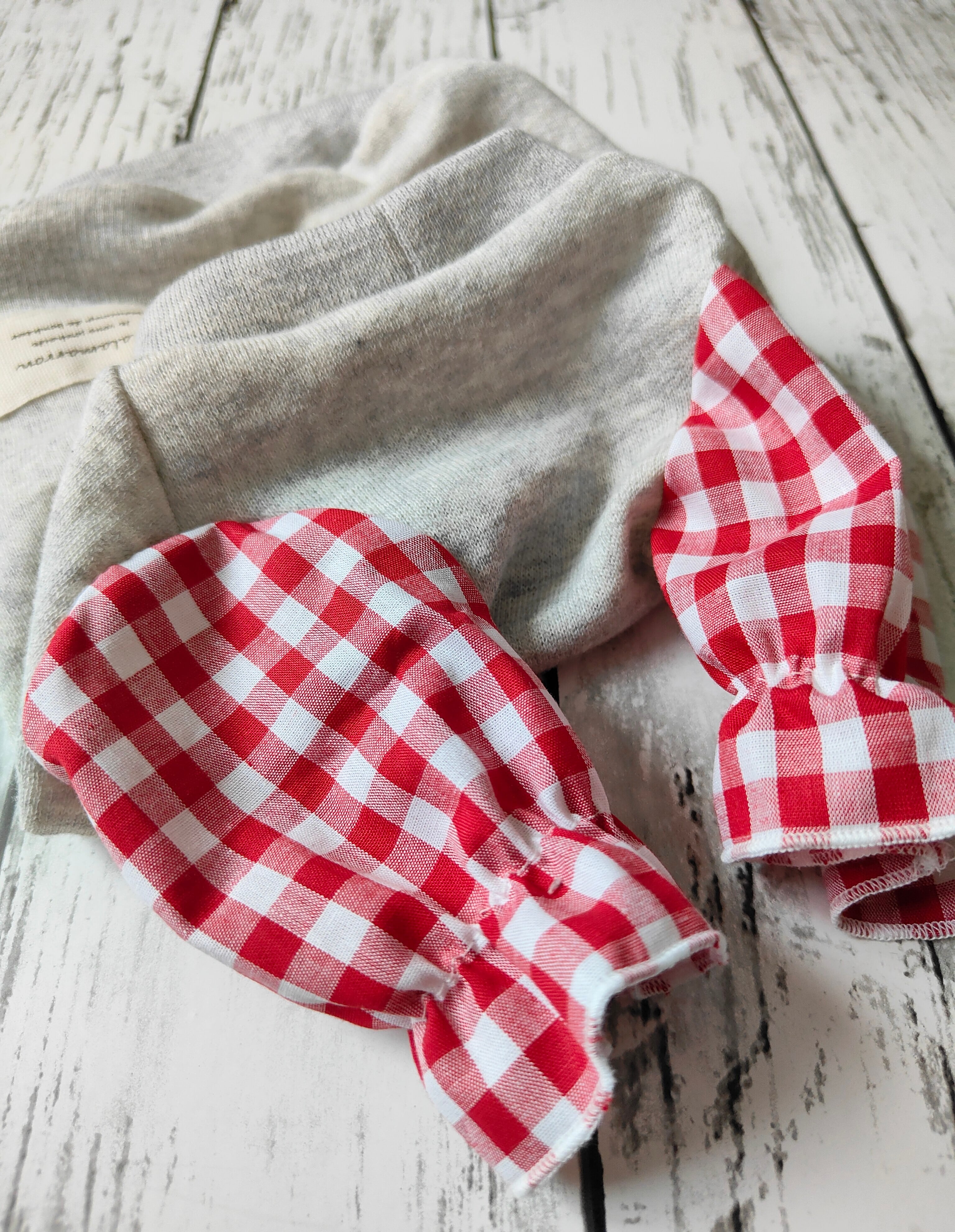 袖は赤と白のギンガムチェックのコットン生地、伸縮性はない布帛ですがゴムでシャーリングさせたポワンとした形です。