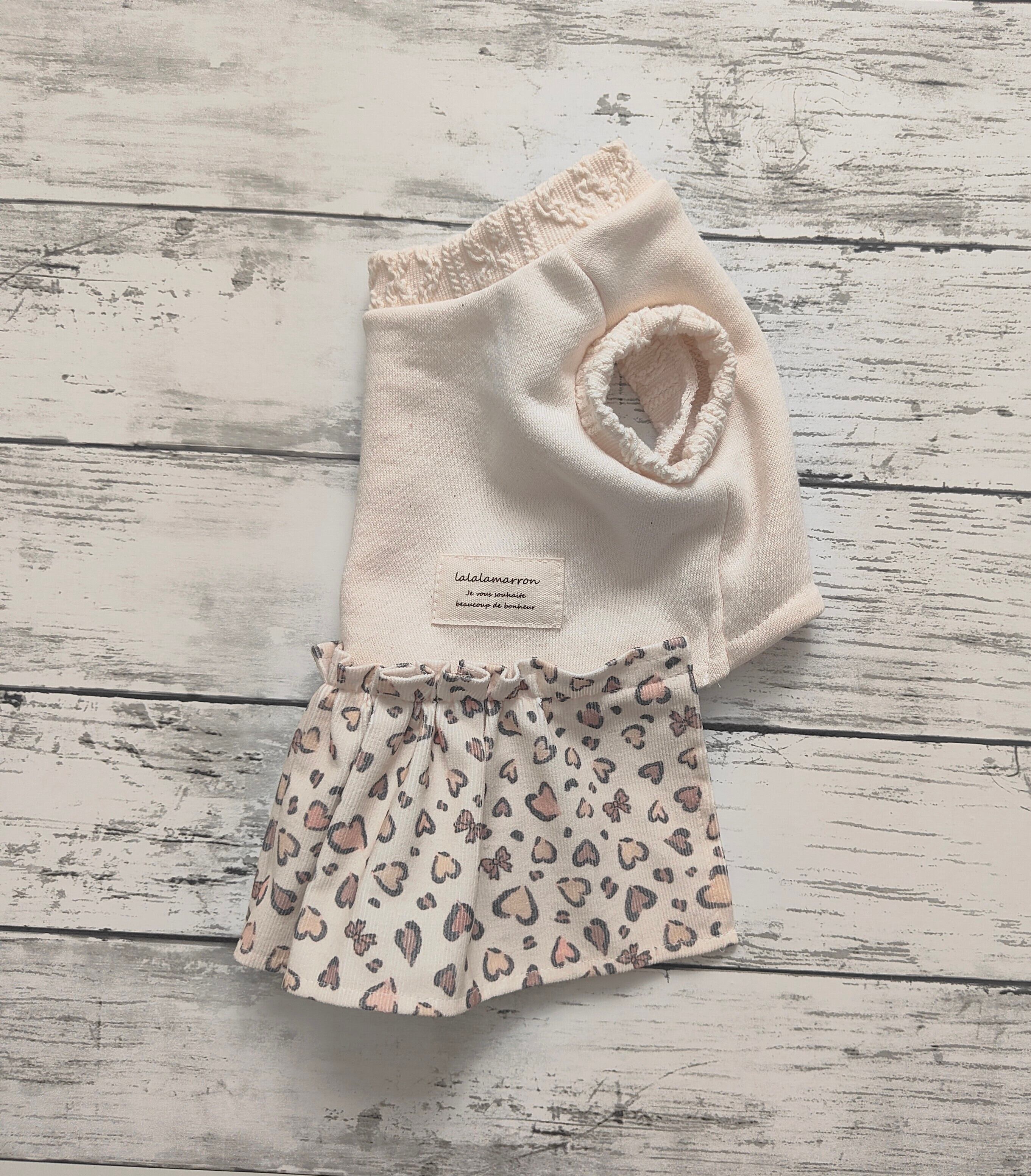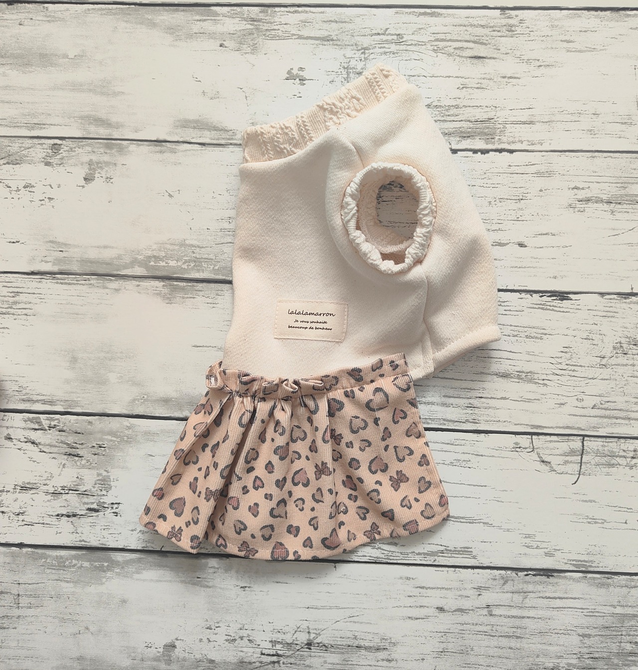 スカートはレオパード柄、やさしいパステルカラーのコーデュロイです。甘すぎないやさしい感じがかわいい生地です。
