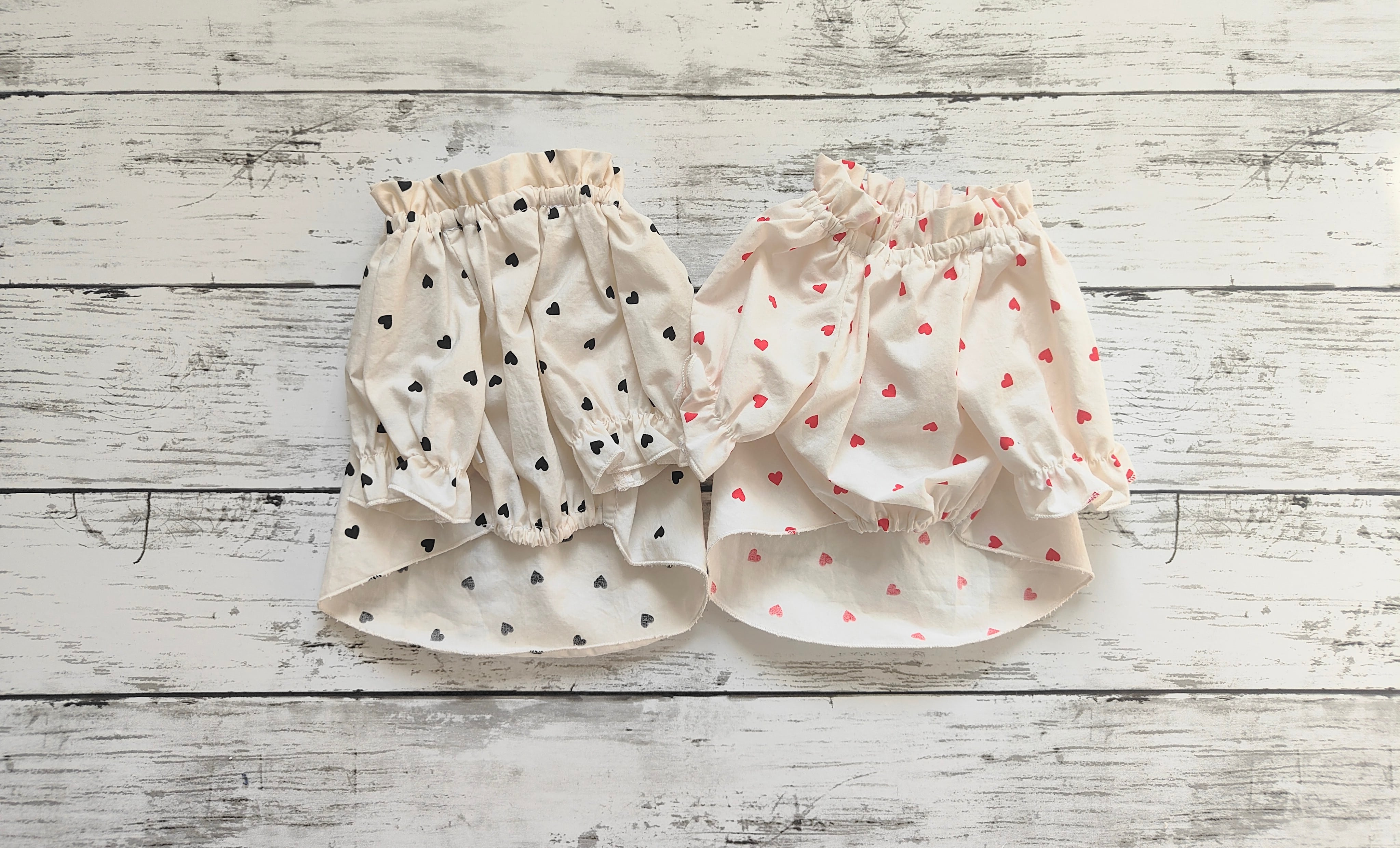 伸縮しない布帛のみで製作しており、ふんわり着ていただきたいシルエットですので、胴回りはゆとり大きめ、ですがおなか側はゴム仕様で、ふんわりかわいいちょうどいい感じだと思います
