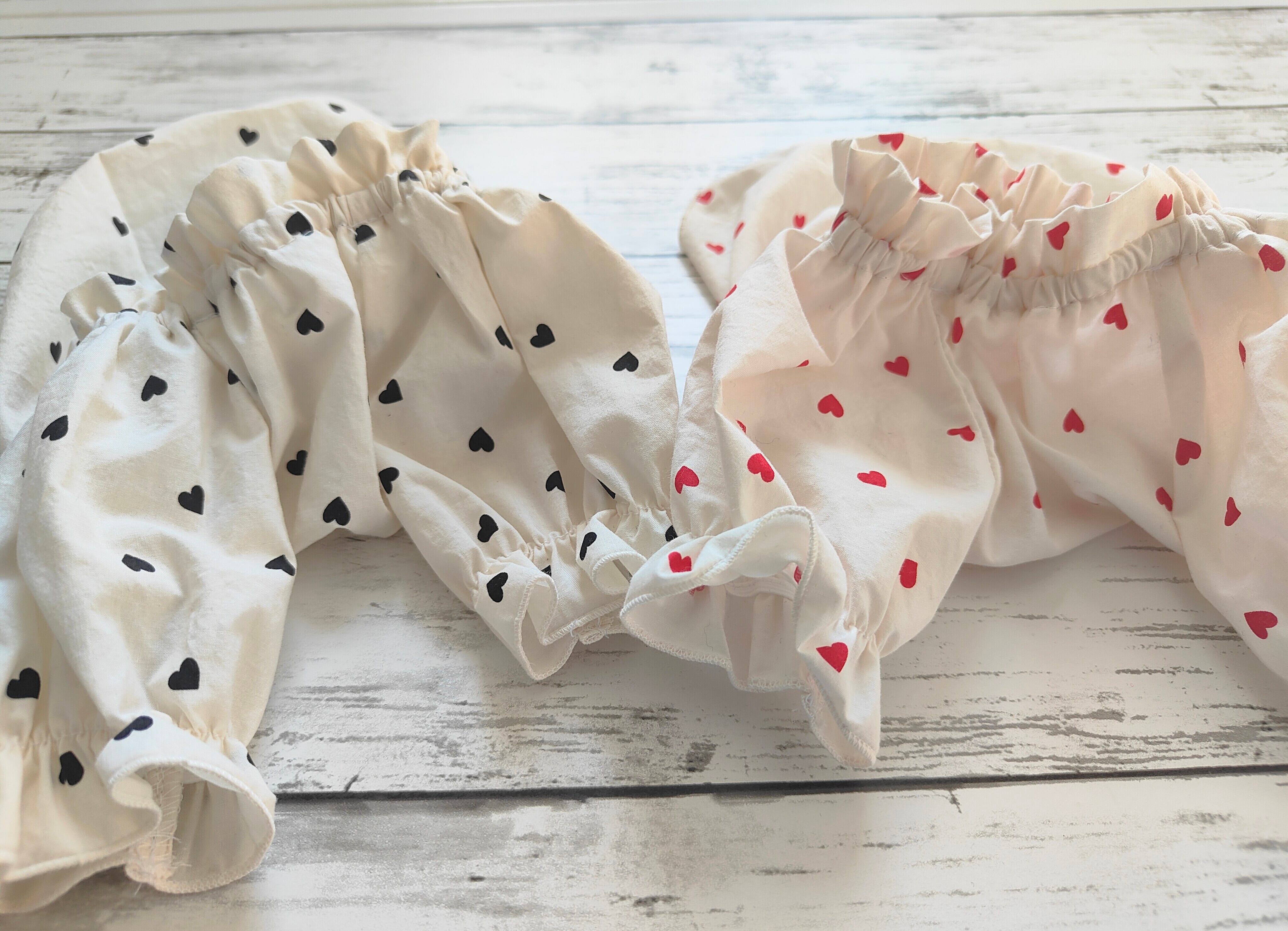 小さなランダムなハートが散りばめられた柄です。薄手ですがぎゅっと密なコットン生地、アパレルでもきれいめのシャツによくあるような、タイプライターのような、やわらかくてさらっとした肌触り、ギャザーもシャーリングもきれいに入る、まさにブラウスに最適な、質のよい生地です。通年着れる生地感、秋冬は特にインナーとしても大活躍な生地感です。