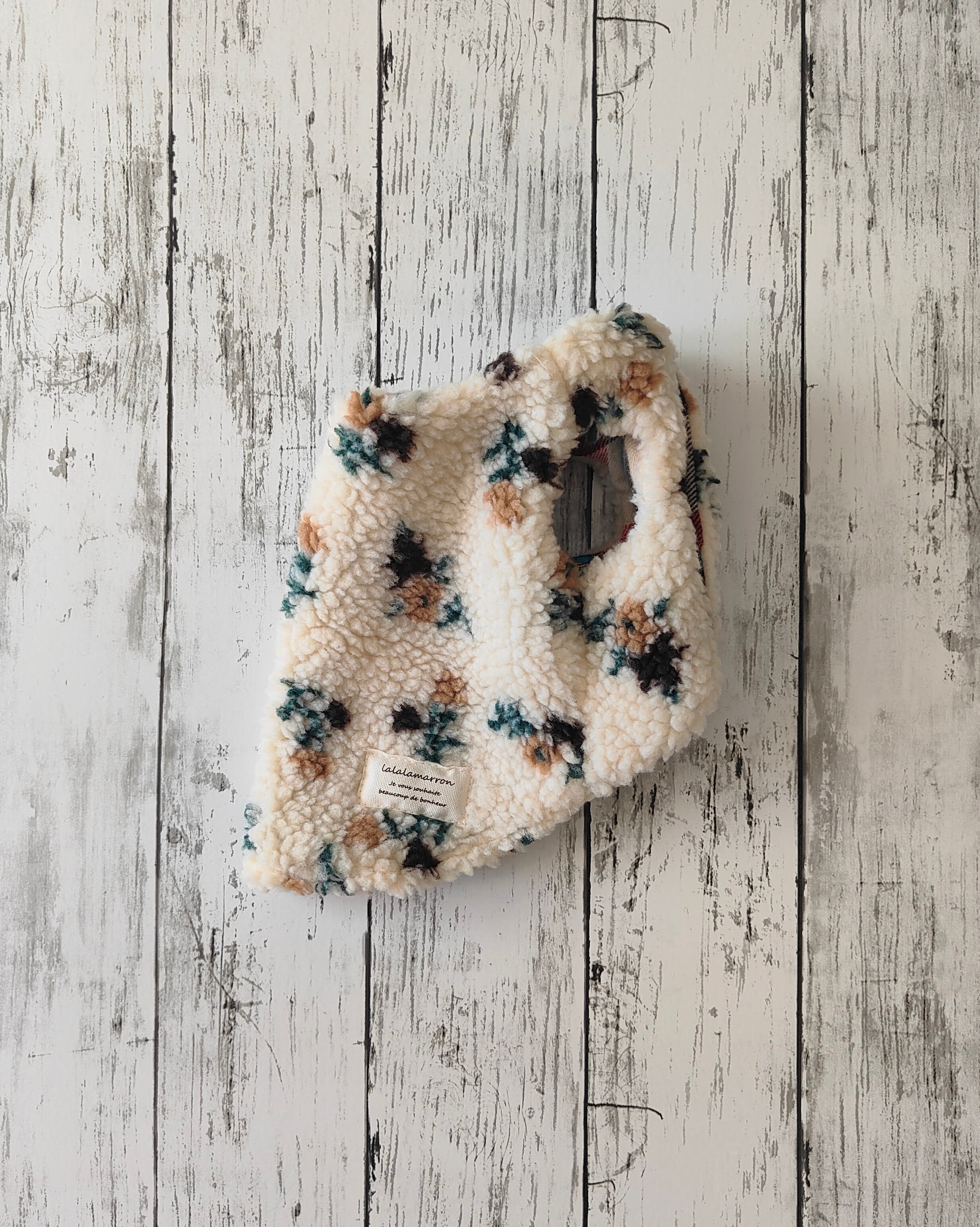 アイボリーにブラウン系のお花柄のもこもこなボア生地です。あったかいボリュームがありますが軽い素材です。