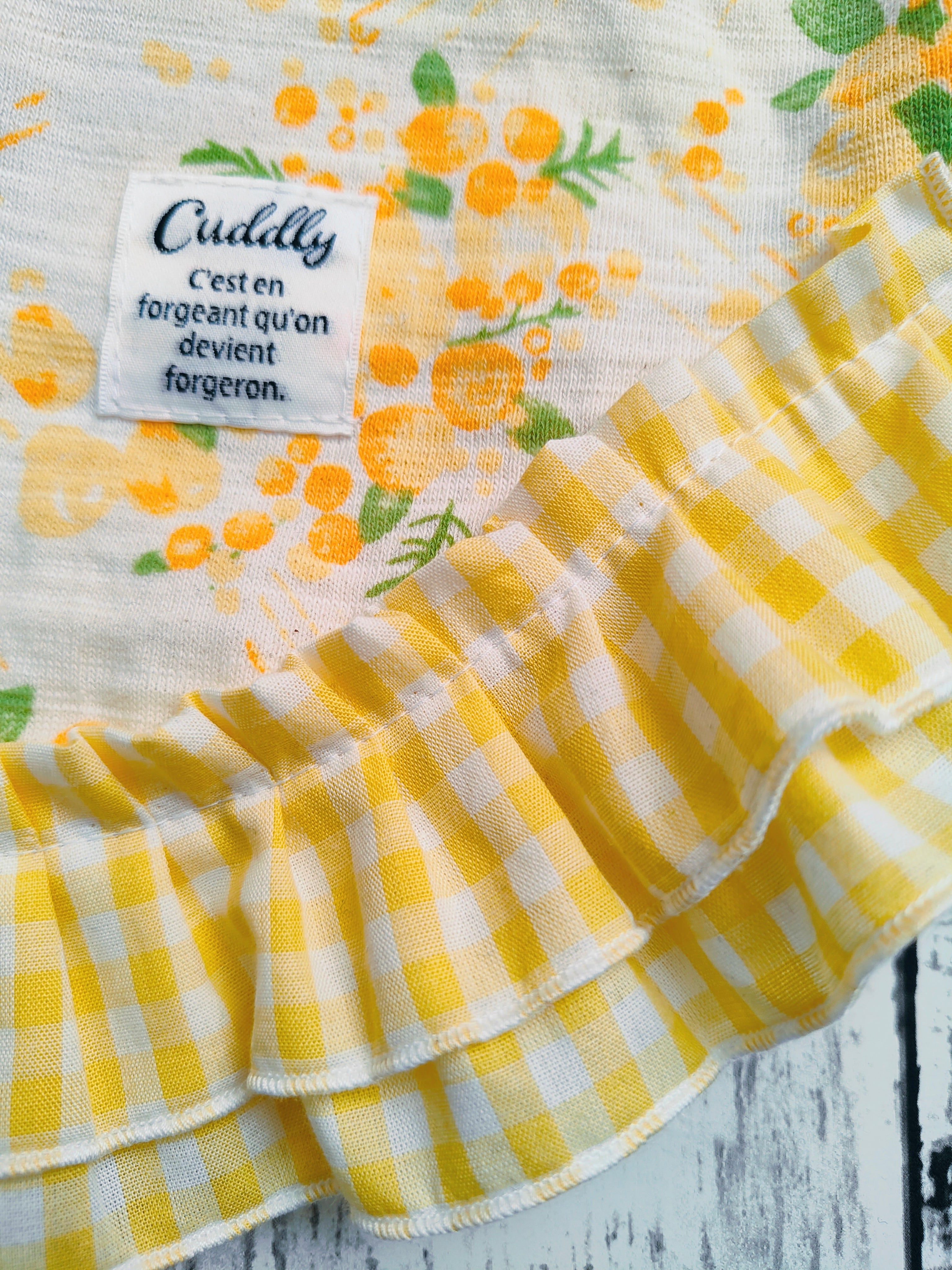 スカートは黄色のギンガムチェック、大きめミモザが隠れてしまわないよう裾に2段のフリルスカートにしました。サンプルは2Sサイズです。