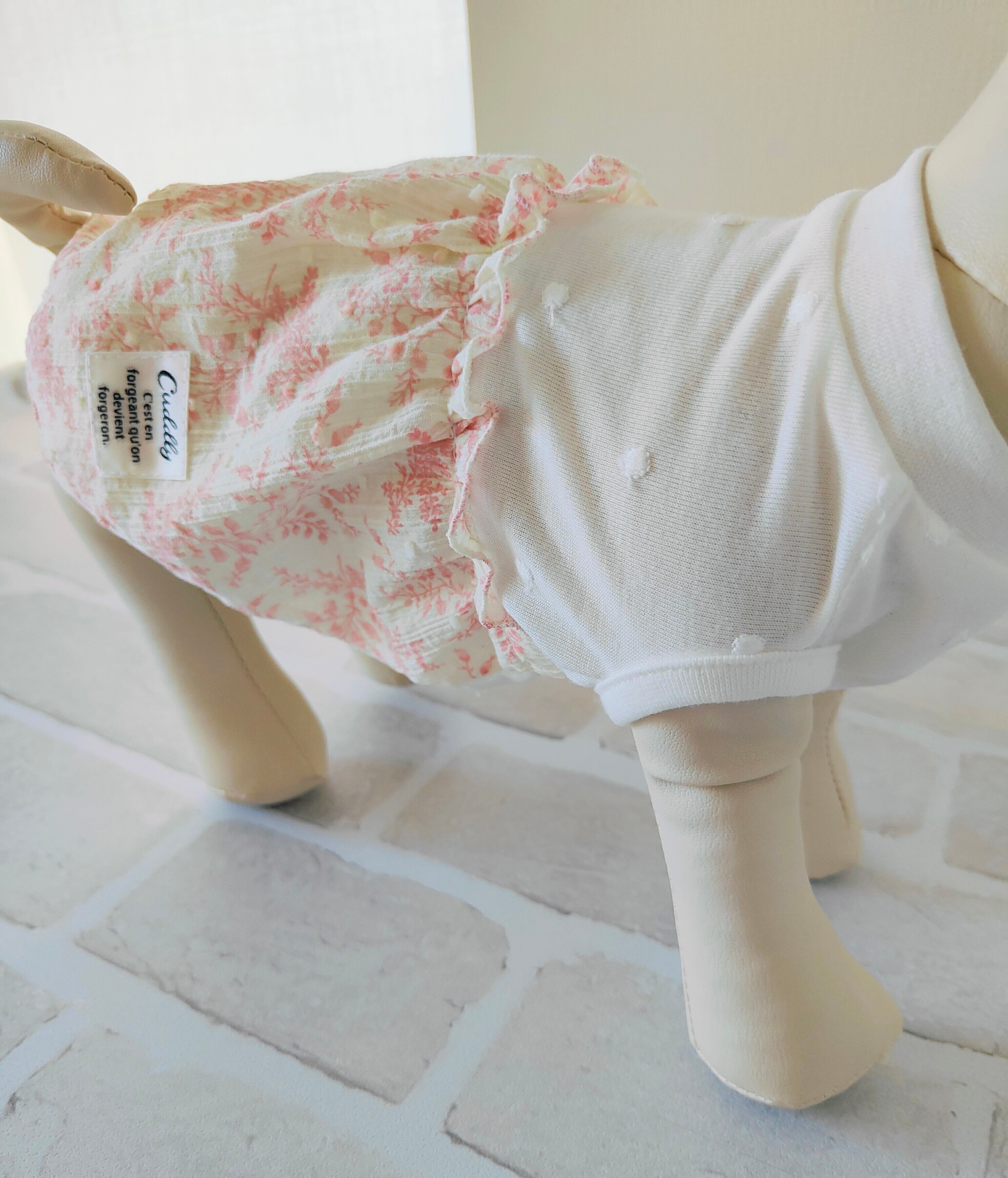 スカートは立体的なスノーカットのドットと、楊柳の特徴的な縦じわがあるコットン100%の生地です。特有のシワ感により、通気性に優れ、生地が肌へ張り付きにくく軽やかで、見た目も柔らかく優しい雰囲気です。生成りにやさしいピンクのヴィンテージフラワー柄です。